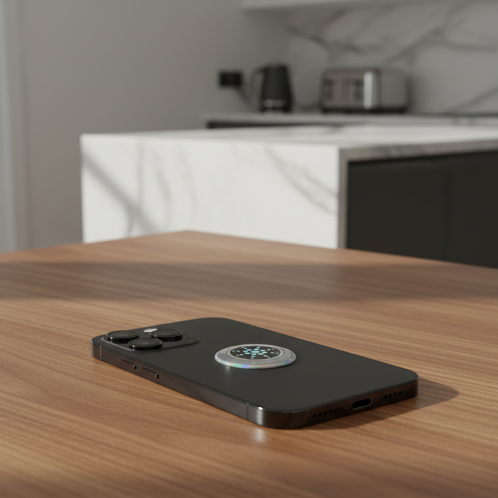 Naklejka umieszczana jest na tylnej obudowie telefonu i działa w sposób całkowicie pasywny:
